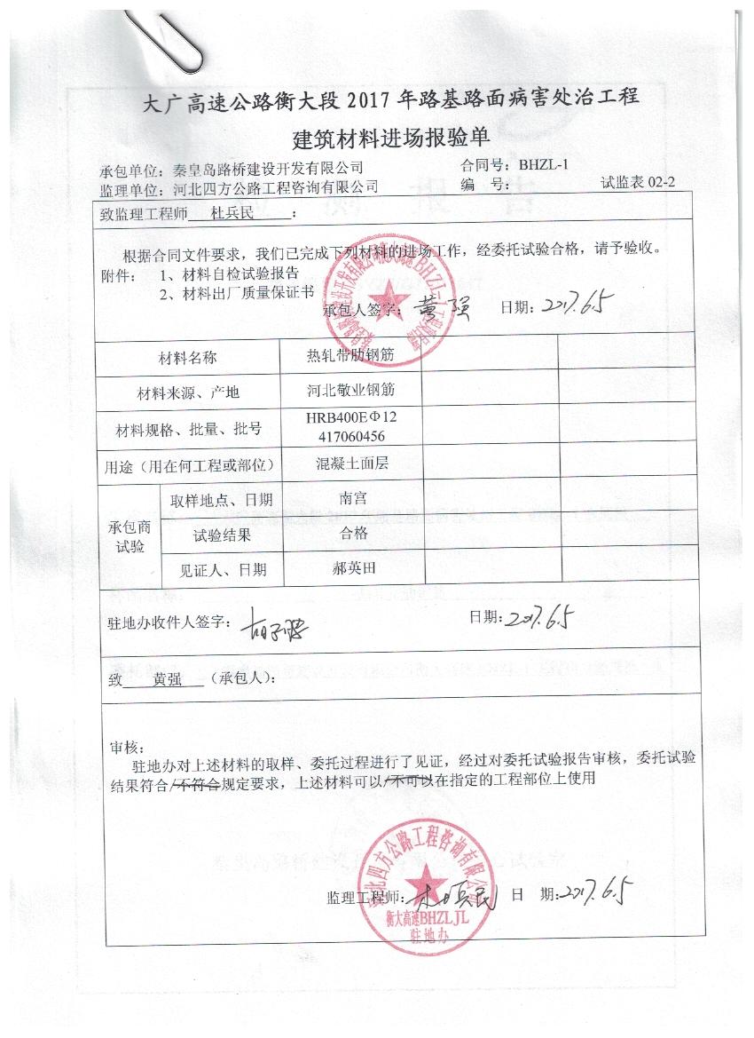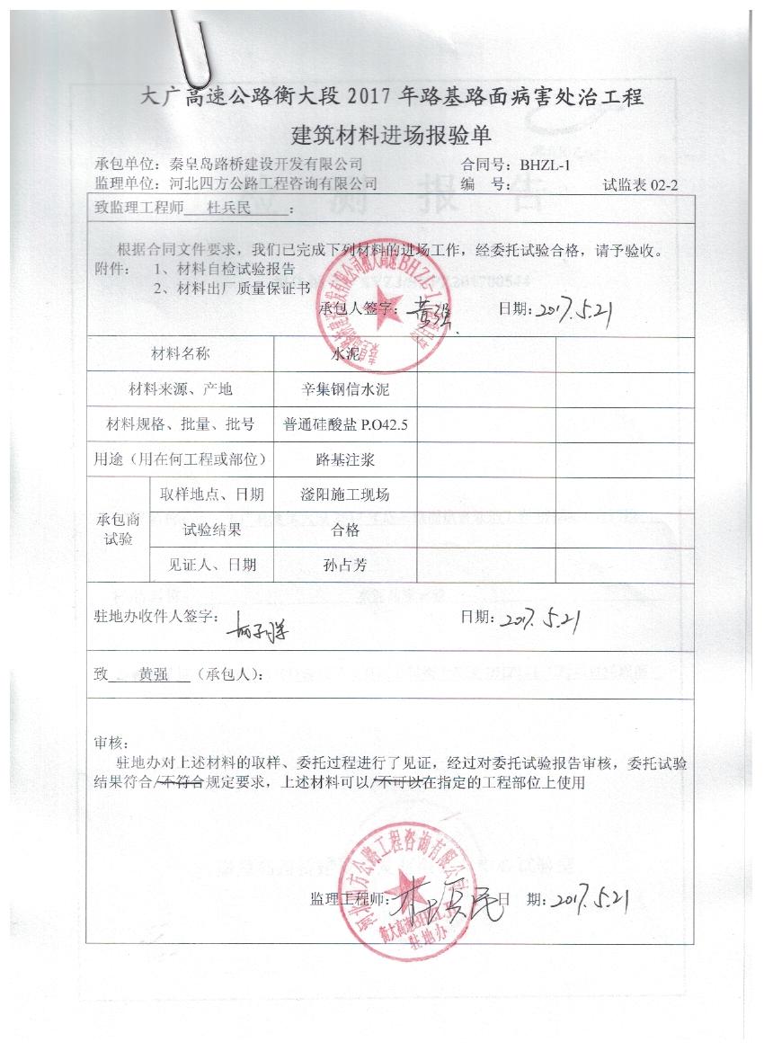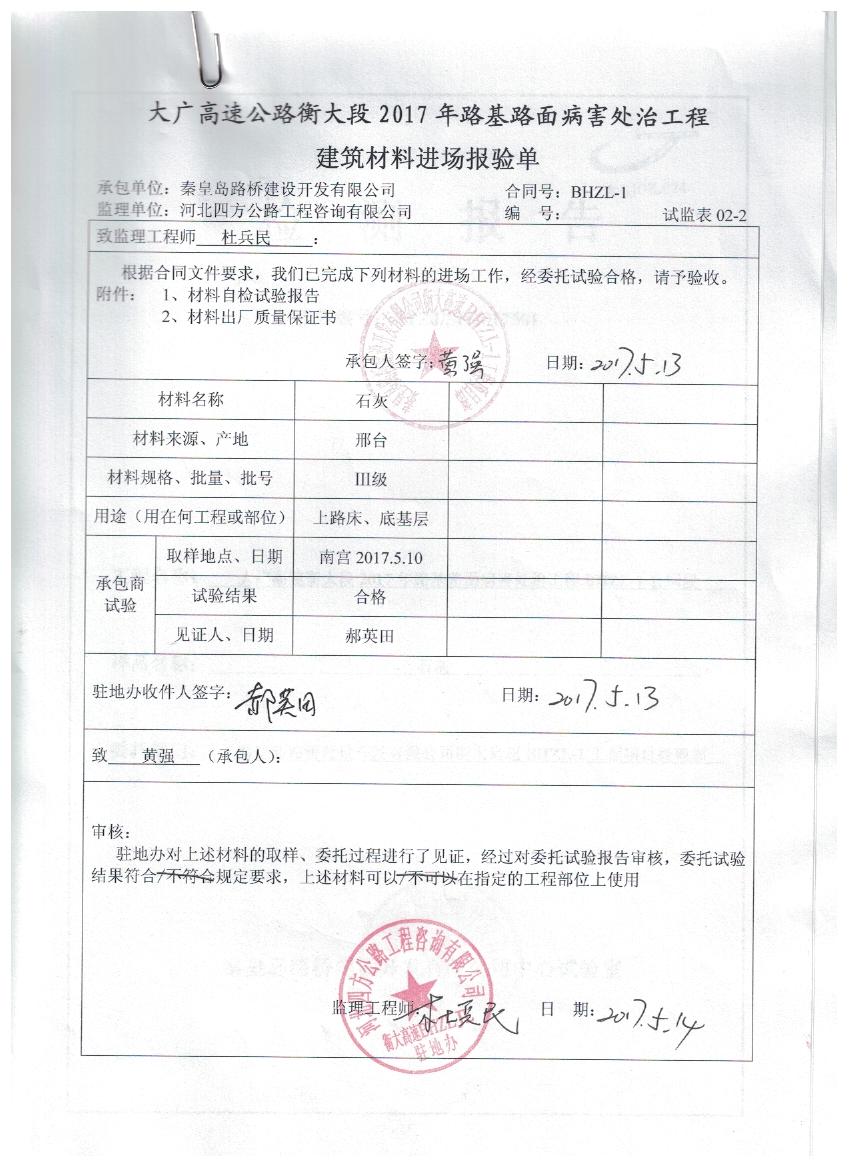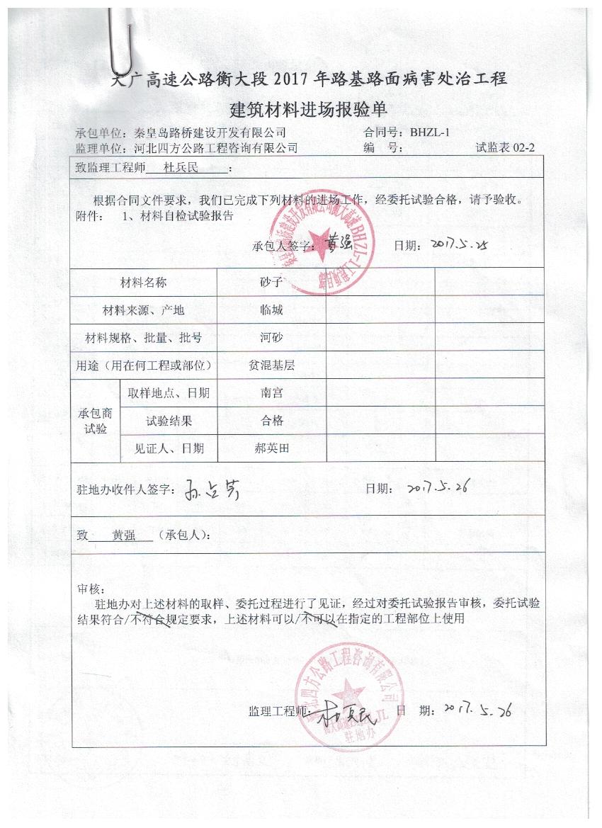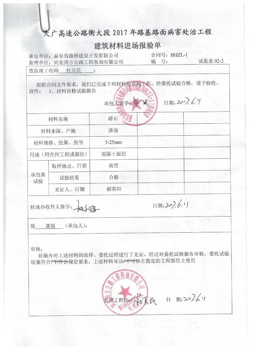 大广高速公路衡大段2017年路基路面病害处治工程BHZL-1标段原材料管理