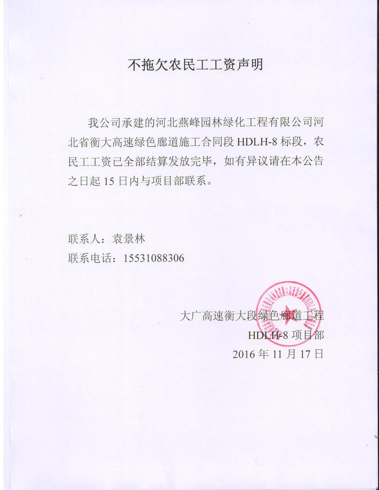 绿色廊道施工HDLH-6无拖欠农民工工资声明