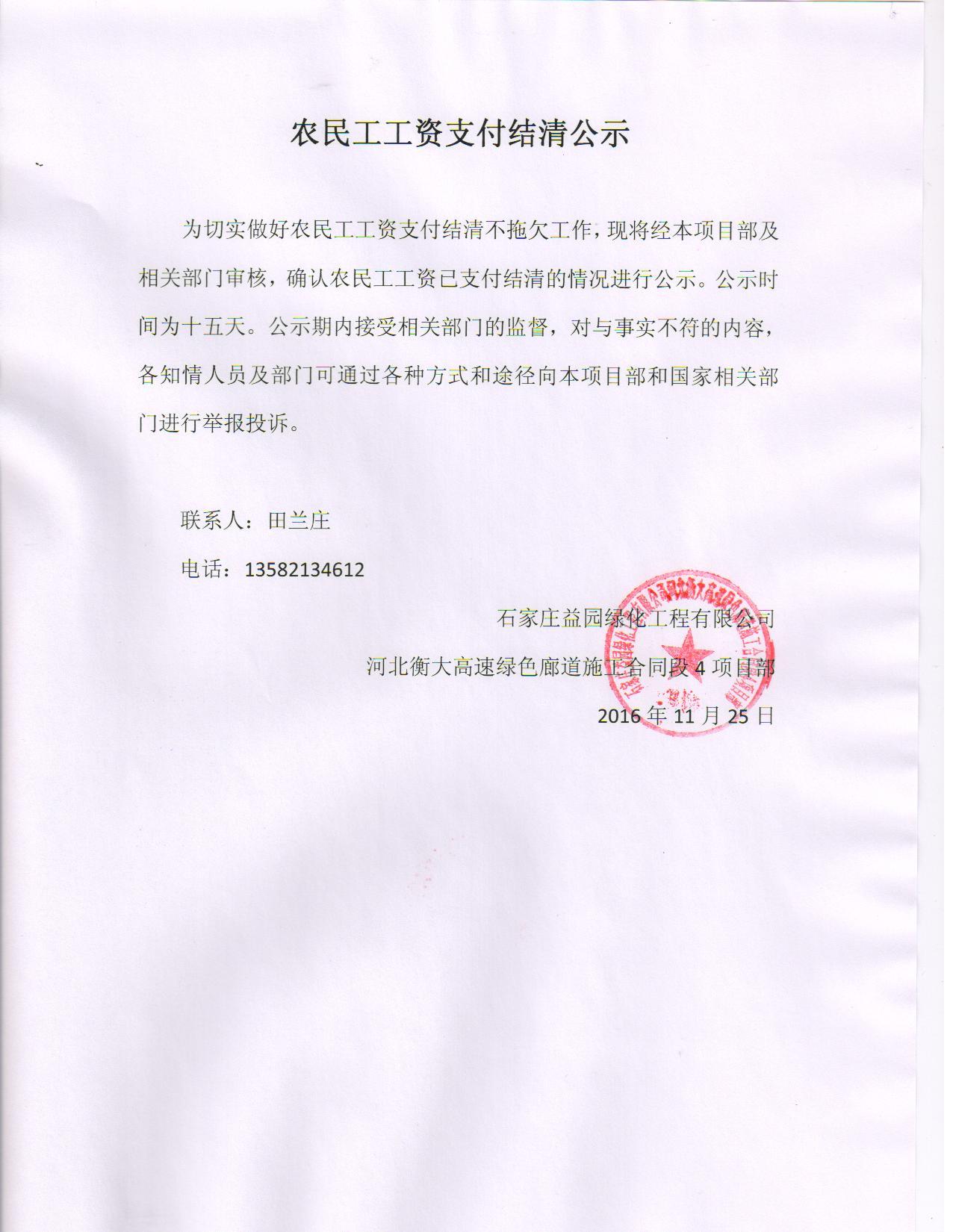大广高速公路衡大段2017年路基路面病害处治工程BHZL-1标段农民工工资管理